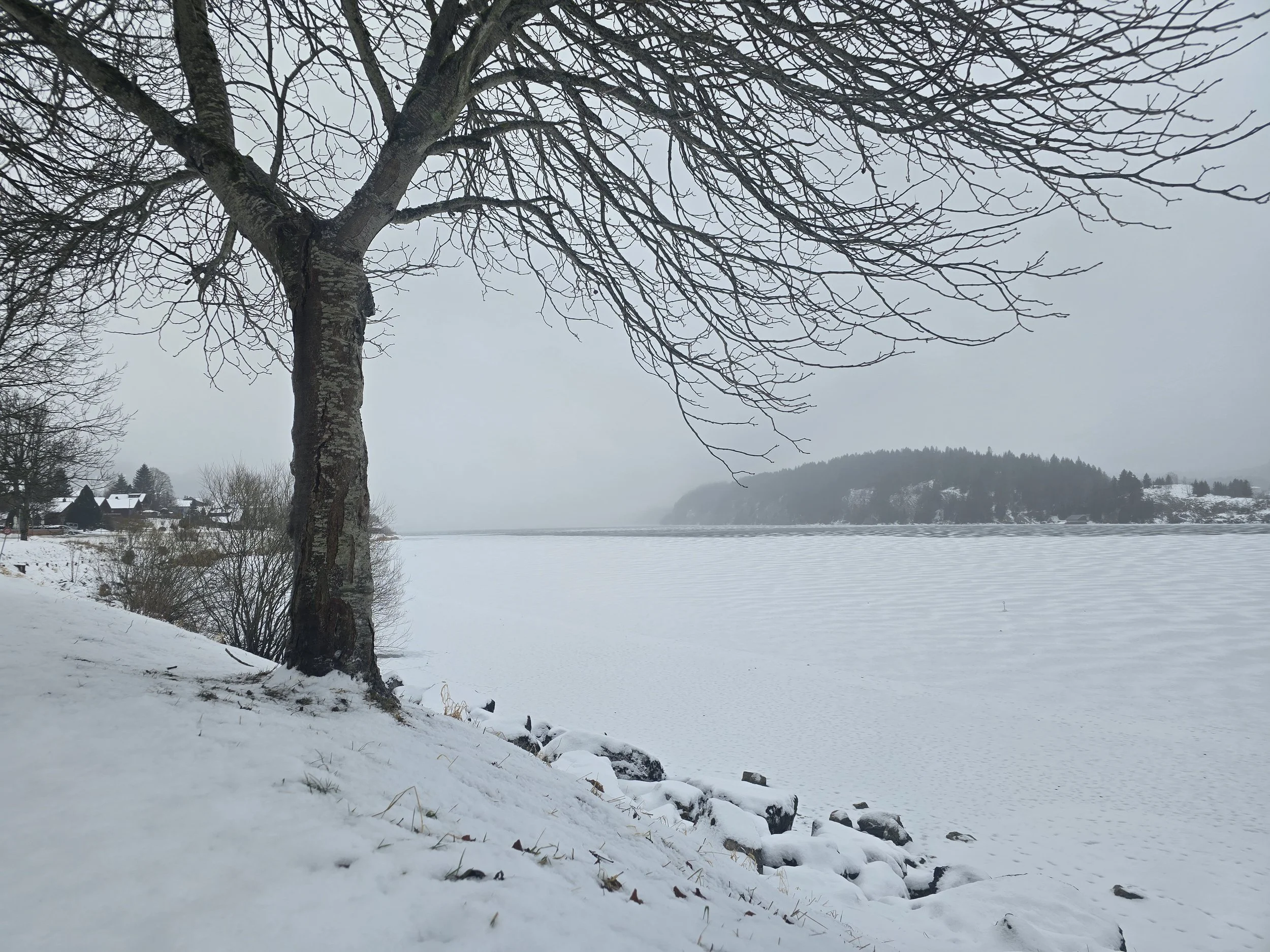 Un árbol solitario se alza frente al lago helado, como un guardián antiguo que conoce todos los inviernos del mundo. A sus pies, la nieve dibuja un territorio de calma, y las casas al fondo parecen susurrar una vida que se refugia del frío. El paisaje entero es una pausa: un instante suspendido donde la naturaleza habla en voz baja.